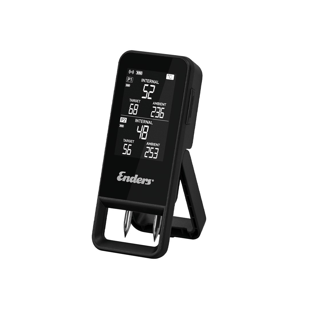 CONTROL COMPLET AL TEMPERATURII Fara fir si cu precizie, termometrul Bluetooth CELSIO II monitorizeaza temperatura gratarului cu ajutorul celor doi senzori din otel inoxidabil. Acesta masoara atat temperatura interna a alimentelor, cat si temperatura din jurul gratarului. Puteti urmari aceste valori fie direct pe ecranul LCD Always-On, fie in mod confortabil in aplicatia Enders de pe dispozitivul dvs. inteligent. Si asta nu este tot: temperatura dorita, care este afisata, de altfel, poate fi selectata direct din aplicatie, din biblioteca de niveluri de gatire. Aceasta contine temperaturile recomandate pentru diferitele niveluri de gatire a numeroase tipuri de carne si peste. In plus, aplicatia salveaza informatiile despre sesiunile dvs. anterioare de gatit la gratar, astfel incat sa puteti urmari oricand evolutia temperaturii in istoric si sa va puteti planifica urmatoarele experiente la gratar cu si mai multa precizie. Astfel, nu veti mai rata niciodata punctul perfect de preparare!