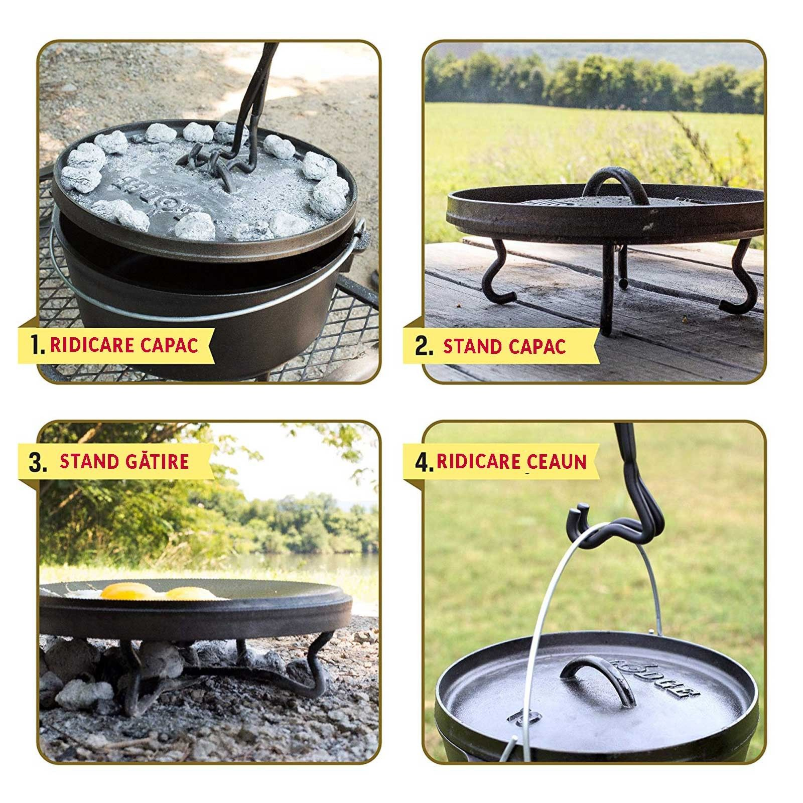 Unealta 4 in 1 este instrumentul multifunctional ideal pentru gatirea in stil camping. Va protejeaza mainile de expunerea la temperatura ridicata, va ajuta sa gatiti tinand ceaunul suspendat si va mareste suprafata de gatit. Poate fi utilizata ca suport pentru ceaun, ca sa ridicati capacul, ca suport pentru capac si ca sa ridicati ceaunul de maner.