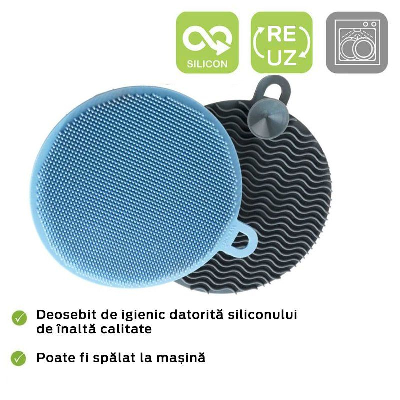 Buretii au dezavantajul ca germenii, bacteriile si alti agenti patogeni se simt rapid ca acasa si gasesc aici un teren de reproducere adecvat. Buretele de clatire fiabil din setul practic de 2 bucati de la WENKO pune capat acestui inconvenient, deoarece este deosebit de igienic si nu le da nicio sansa germenilor. Buretele din silicon de inalta calitate este ideal pentru suprafetele sensibile, deoarece are o structura fina pe o parte pentru murdaria usoara, iar reversul ferm curata in mod eficient. In acest fel, oalele si tigaile mudare pot fi curatate foarte bine si usor. Curatarea igienica cu buretele de uz casnic actioneaza delicat si asupra paharelor, a suprafetei aragazului si a vaselor delicate - si asta fara a le zgaria. Proprietatea de uscare rapida a buretelui previne, de asemenea, aparitia mirosurilor neplacute. Accesoriul acesta de curatare a oalelor si vaselor este rezistent si poate fi utilizat in multe moduri in gospodarie. Atunci cand nu sunt utilizati, buretii in culorile la moda albastru si negru pot fi agatati la indemana, intr-un mod care economiseste spatiu, cu ajutorul ventuzei sau a inelului de agatat. Bineinteles, daca este necesar, este posibila si o curatare rapida si usoara a lor in masina de spalat vase. In gama variata de accesorii de bucatarii WENKO, veti gasi cu siguranta si alte accesorii in culori asortate care va vor usura spalatul vaselor.