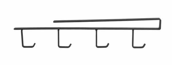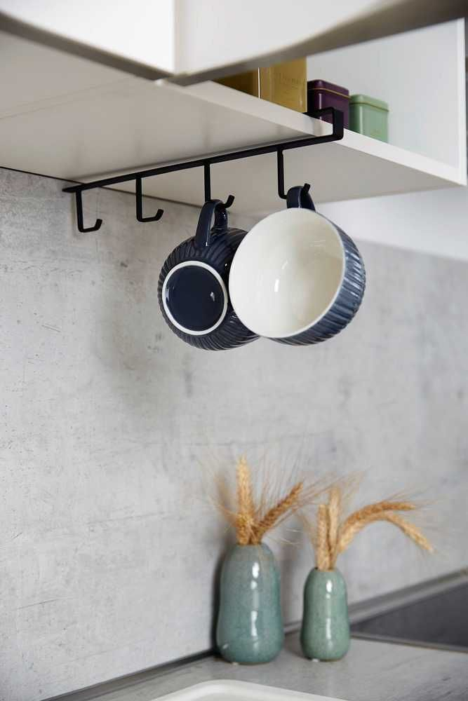 Daca spatiul in bucatarie este limitat, suportul decorativ negru cu carlige pentru cesti sau cani este o alternativa practica pentru a depozita cat mai multe cani sau cesti intr-un mod ordonat si care economiseste spatiu in dulap sau sub raft. La nevoie, suportul poate fi indepartat din nou cu ajutorul unui maner. Canile clatite si curate sunt pur si simplu agatate de maner in suportul practic pentru pahare. Acest lucru inseamna ca pana la 4 cesti sunt intotdeauna depozitate in siguranta si protejate de praf. Nu este nevoie sa faceti gauri in dulapuri sau rafturi, deoarece suportul pentru cesti gliseaza pur si simplu peste un raft. Paharele sunt atarnate in siguranta si in pozitie dreapta. Suportul de suspendare este antiderapant, fabricat din metal robust si potrivit pentru o grosime a raftului de aproximativ 2 cm. Vestea cu adevarat buna este ca puteti folosi suportul cu carlige si intr-un dressing pentru a agata accesorii de imbracaminte, gen curele, esarfe, ceea ce ii confera acestuia caracter cu adevarat multifunctional.