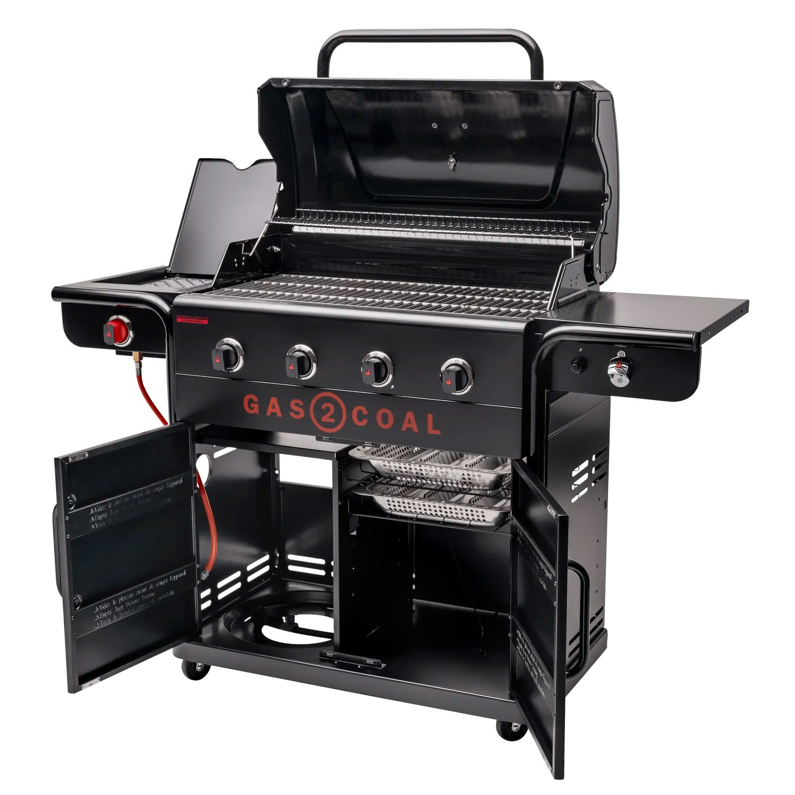 Pentru toti pasionatii de gratare care doresc putina flexibilitate: editia speciala a Gas2Coal ofera si mai multe caracteristici, pentru o experienta perfecta de gratar pe gaz si pe carbuni. Arzatorul ceramic pentru rumenire este un element nou si poate atinge temperaturi de pana la 900 °C. In plus, gratarul este prevazut cu o plita suplimentara. Fie ca preferati gazul sau carbunele, gratarul sau plita, friptura cu crusta perfecta sau gatitul lent - cu editia speciala Gas2Coal sunteti perfect echipat pentru orice activitate de gratar. Cu ajutorul tavii patentate pentru carbuni, puteti converti gratarul de la gaz la carbuni in mai putin de 60 de secunde - si asta, fara unelte. Gratarul Gas2Coal cu 4 arzatoare este prevazut cu doua tavi pentru carbuni. Daca folositi doar unul dintre ele, puteti chiar sa faceti gratar cu carbune si gaz in paralel. Optati pentru cea mai buna dintre cele doua modalitati de a face gratar!
