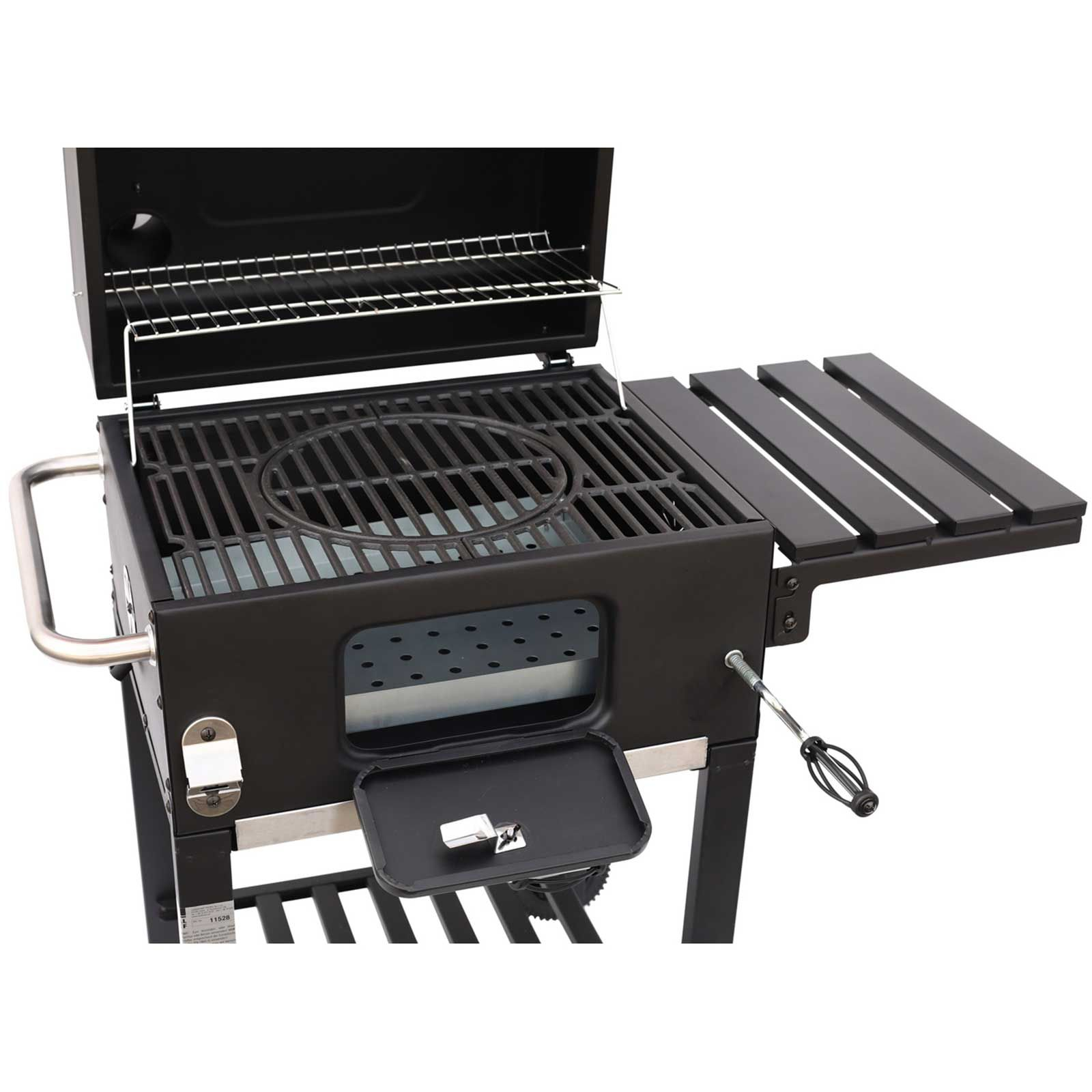 Usa de acces catre zona de ardere ajuta adaugarea carbunilor. O tava de cenusa mare pentru eliminarea practica a reziduurilor de ardere se gaseste convenabil sub zona de ardere. Camera de ardere este echipata cu zone reglabile de ventilatie. Raftul lateral este pliabil si puteti astfel economisi spatiu, iar gratarul este dotat cu un termometru in capac.