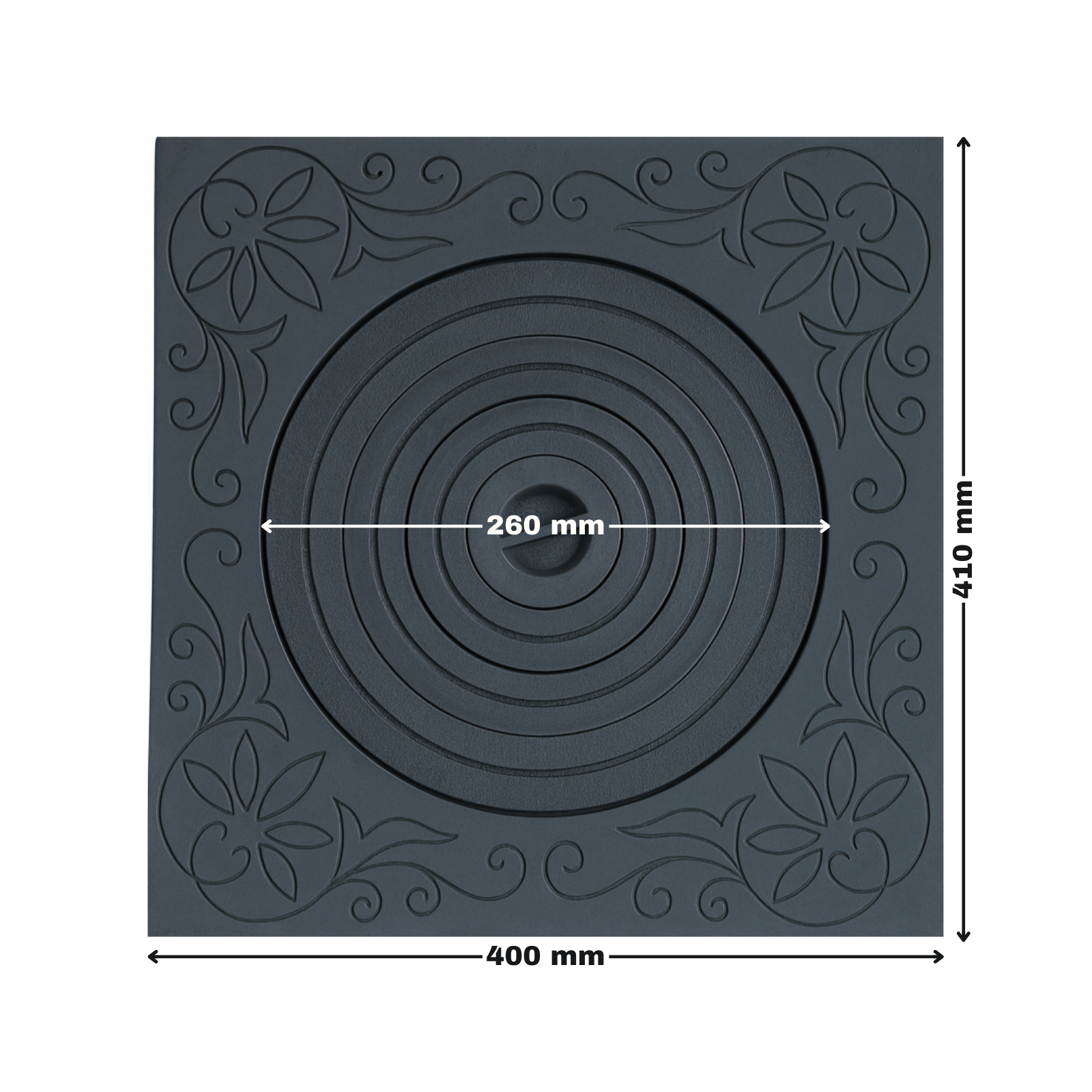 Plită din fontă groasă, potrivită pentru utilizarea în construcția de sobe noi sau pentru renovarea celor vechi. Ochiul este mobil, format din 4 cercuri.