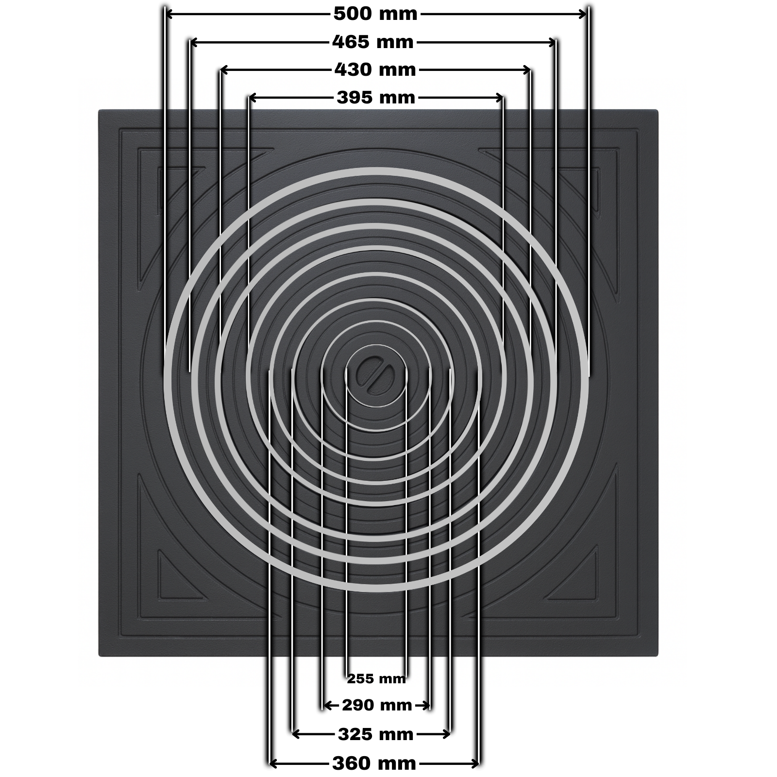 Suprafața plitei este prevăzută cu 8 ochiuri concentrice mobile, care permit utilizarea vaselor de diferite dimensiuni. Diametrul ochiului mare de 500 mm oferă un proces de gătire eficient cu oale, sau ceaune mari. Datorită masei de 29 kg și a materialului din fontă masivă, plita acumulează și menține căldura pentru o perioadă îndelungată, contribuind la un proces de gătire uniform și eficient.