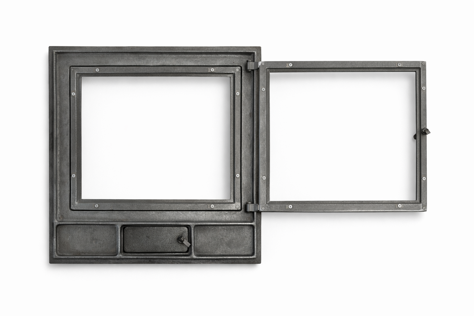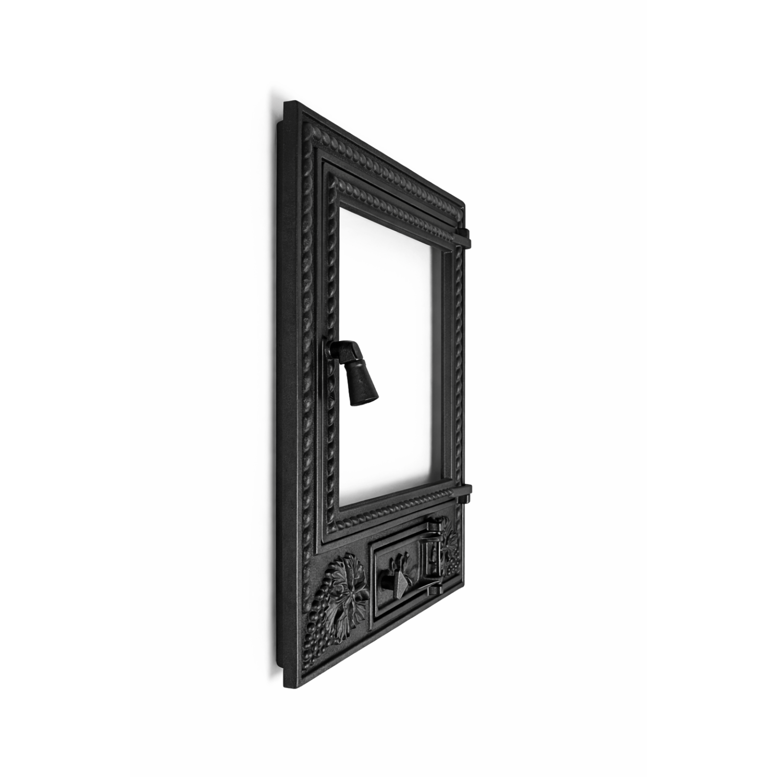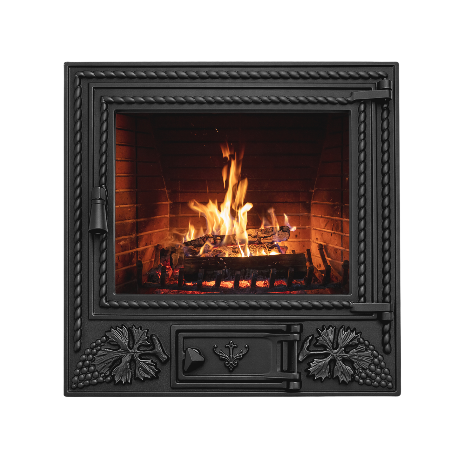 Ușă pentru șemineu fabricată din fontă masivă, prevăzută cu sticlă termorezistentă și cenușar integrat, ideală pentru construcția sau modernizarea șemineelor.