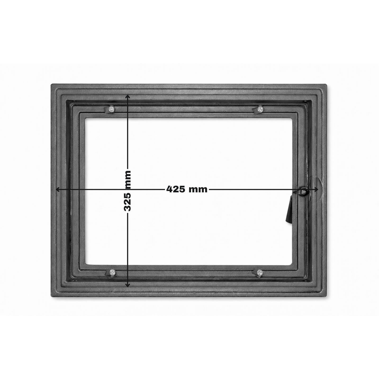 Ușă pentru șemineu fabricată din fontă masivă, echipată cu sticlă termorezistentă, concepută pentru construcția sau modernizarea sobelor sau șemineelor.