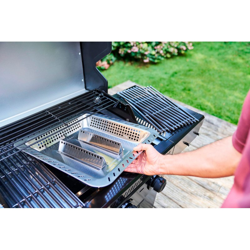 Tava permite utilizarea cărbunilor pe un grătar pe gaz, oferind gust autentic de grătar pe jar, fără a renunța la controlul temperaturii specific grătarelor pe gaz.