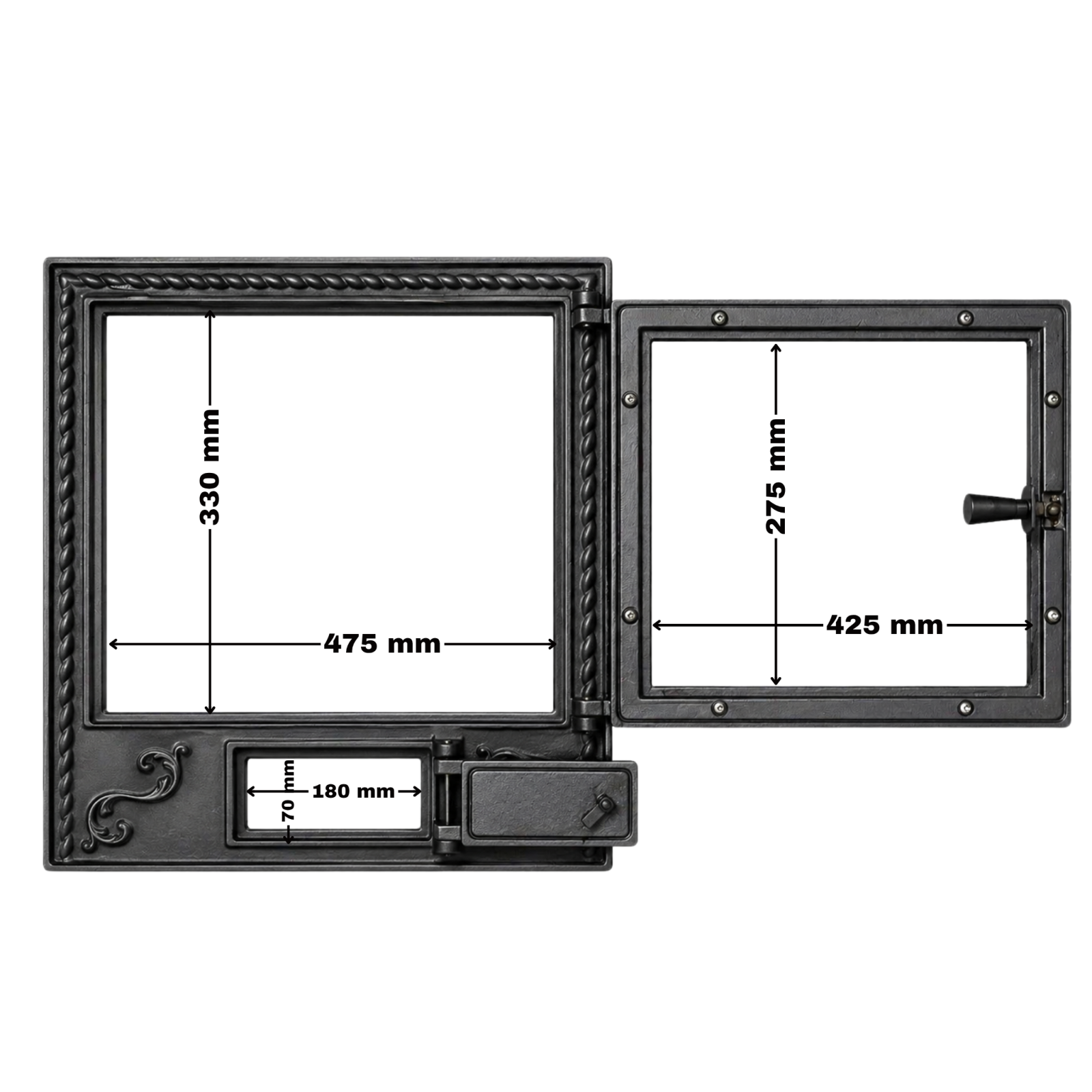 Cu dimensiuni de montaj de 555 x 505 mm, această ușă de șemineu din fontă cu sticlă este ușor de integrat în diverse proiecte, fiind o alegere ideală pentru cei care caută un produs rezistent, funcțional și estetic, potrivit pentru utilizare zilnică.