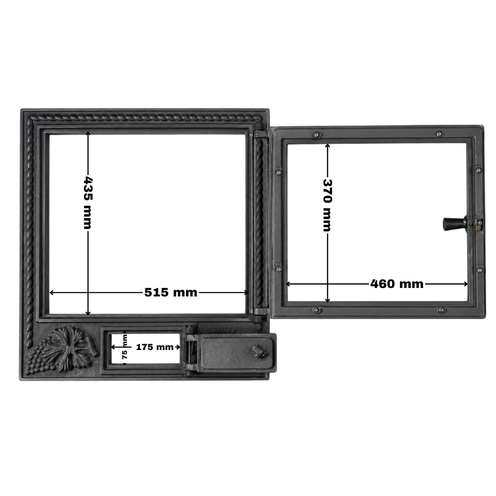 Cu dimensiuni de montaj de 595 x 615 mm, această ușă de șemineu din fontă cu sticlă model Strugure este ușor de integrat în diverse proiecte, fiind o alegere ideală pentru cei care caută un produs rezistent, funcțional și estetic, potrivit pentru utilizare zilnică.