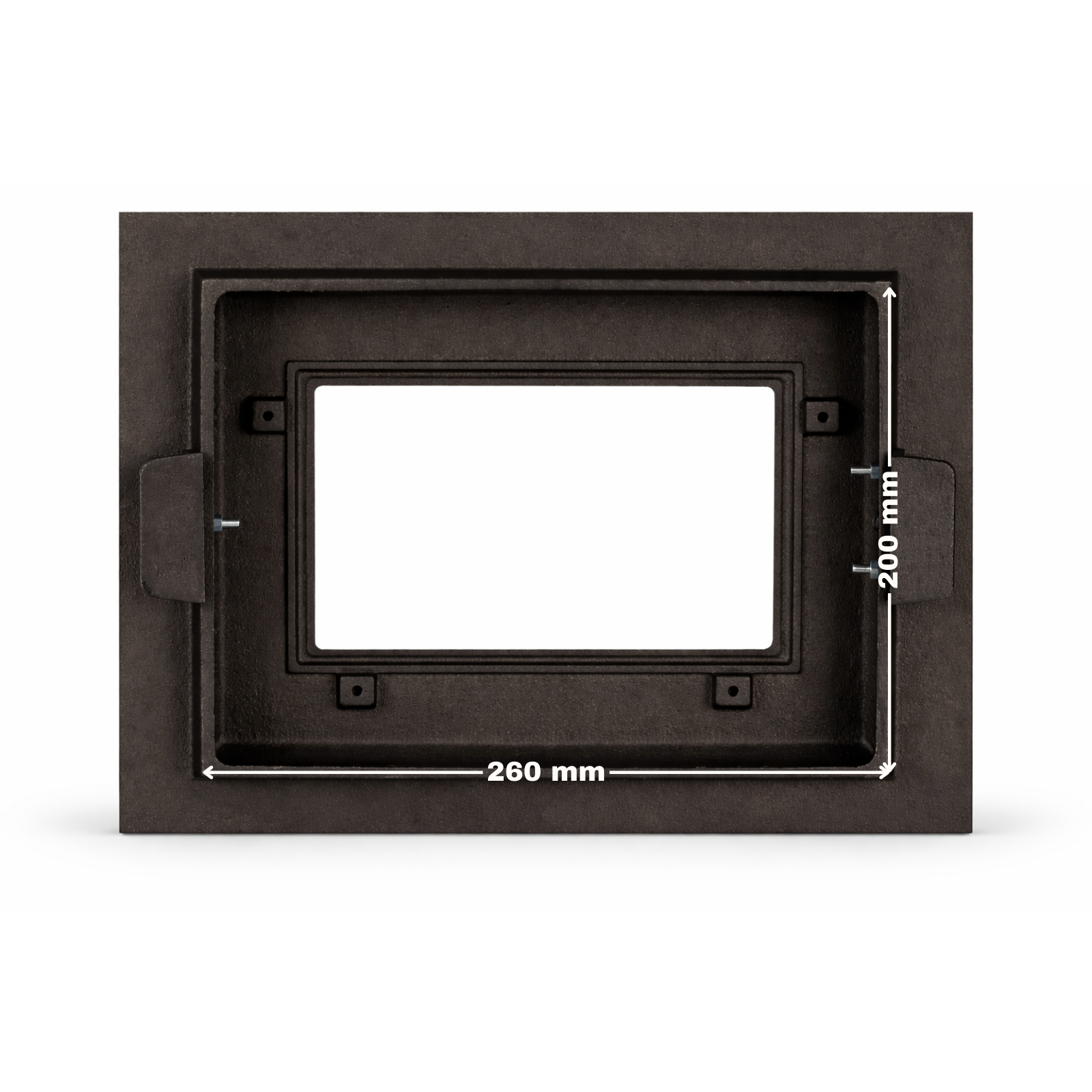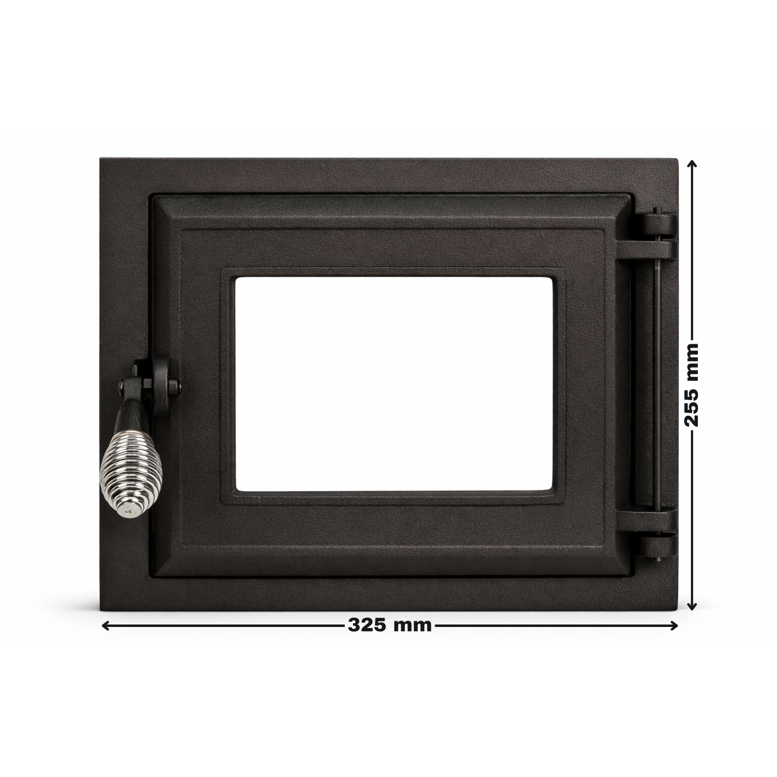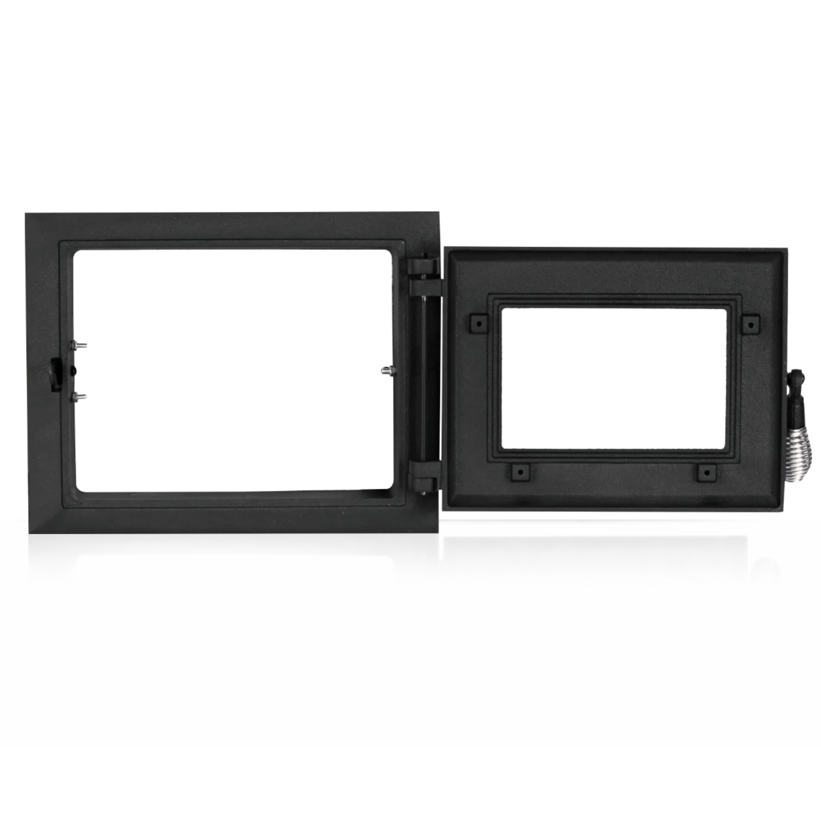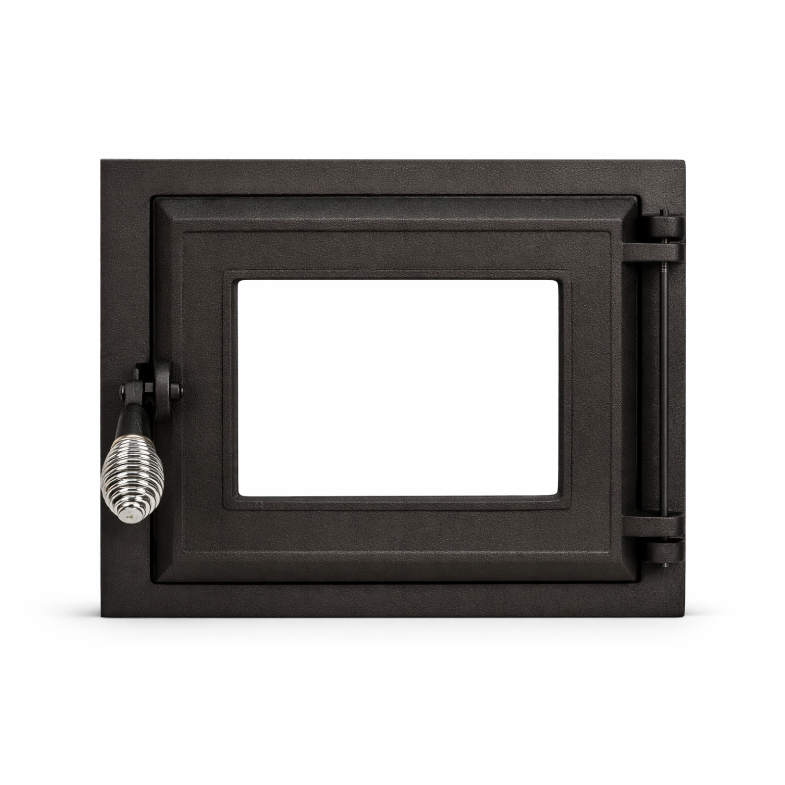 Ușă din fontă cu sticlă termorezistentă, ideală pentru cuptoare pe lemne, sobe sau grătare zidite. Asigură închidere etanșă și menține căldura constantă pentru o coacere uniformă.