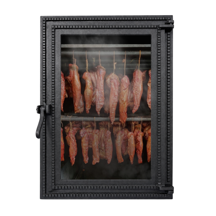 Prevăzută cu geam termorezistent de dimensiuni mari, ușa permite monitorizarea procesului de afumare fără deschidere, evitând pierderile de căldură și fum. Designul robust, fără grilă de ventilație, este optim pentru afumare, unde este necesar un control mai stabil al fluxului de aer. Construcția solidă și sistemul de închidere contribuie la siguranță și eficiență în utilizare.