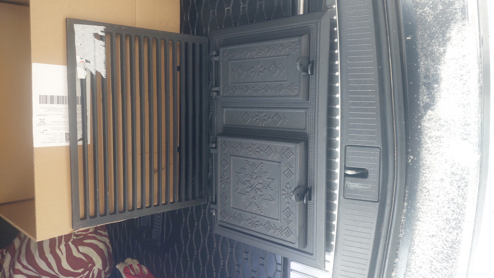 Ușă pentru sobă cu cenusar, tip monobloc, confecționată din fontă cenușie turnată cu model reliefat, acoperită pentru rezistență la coroziune cu vopsea neagră mata.