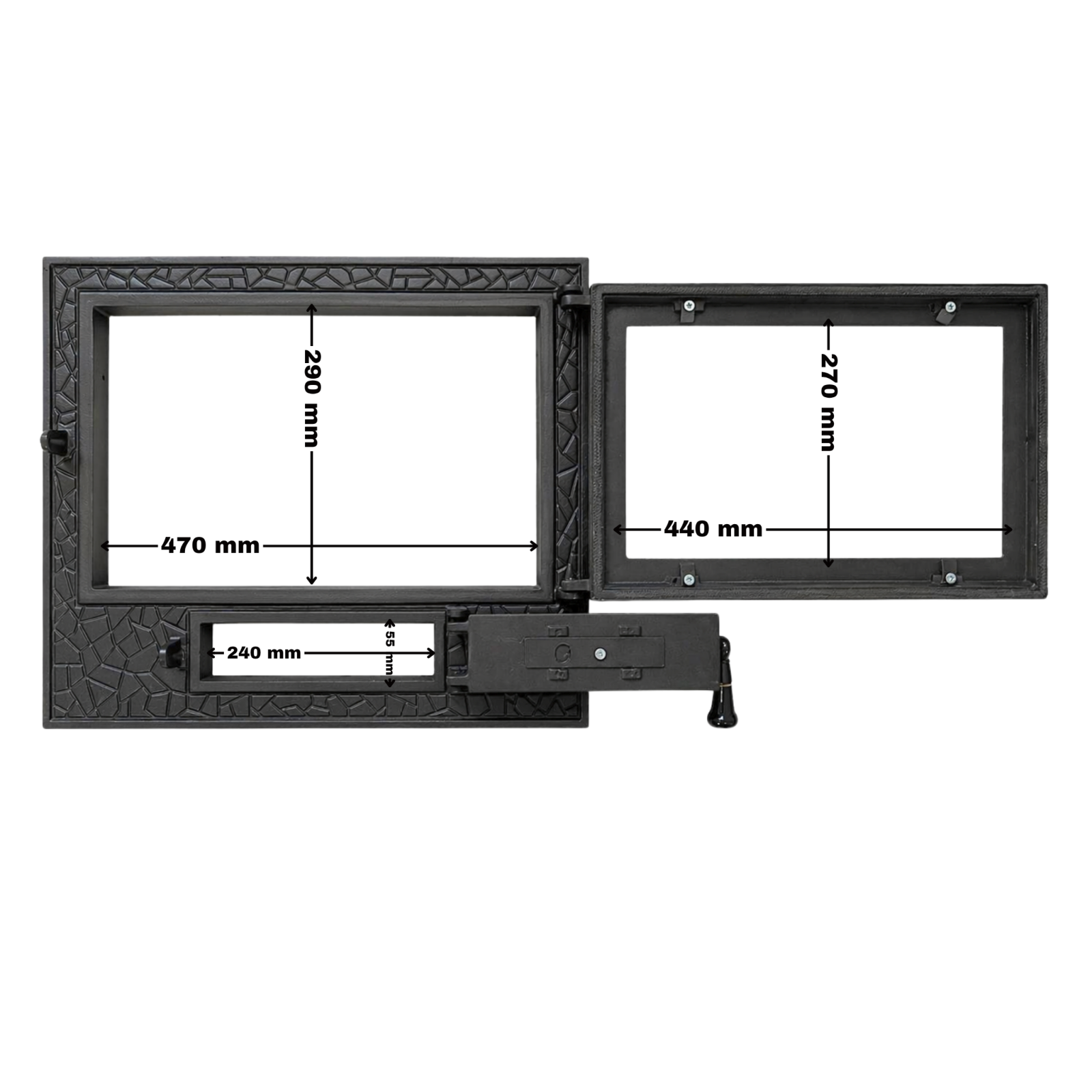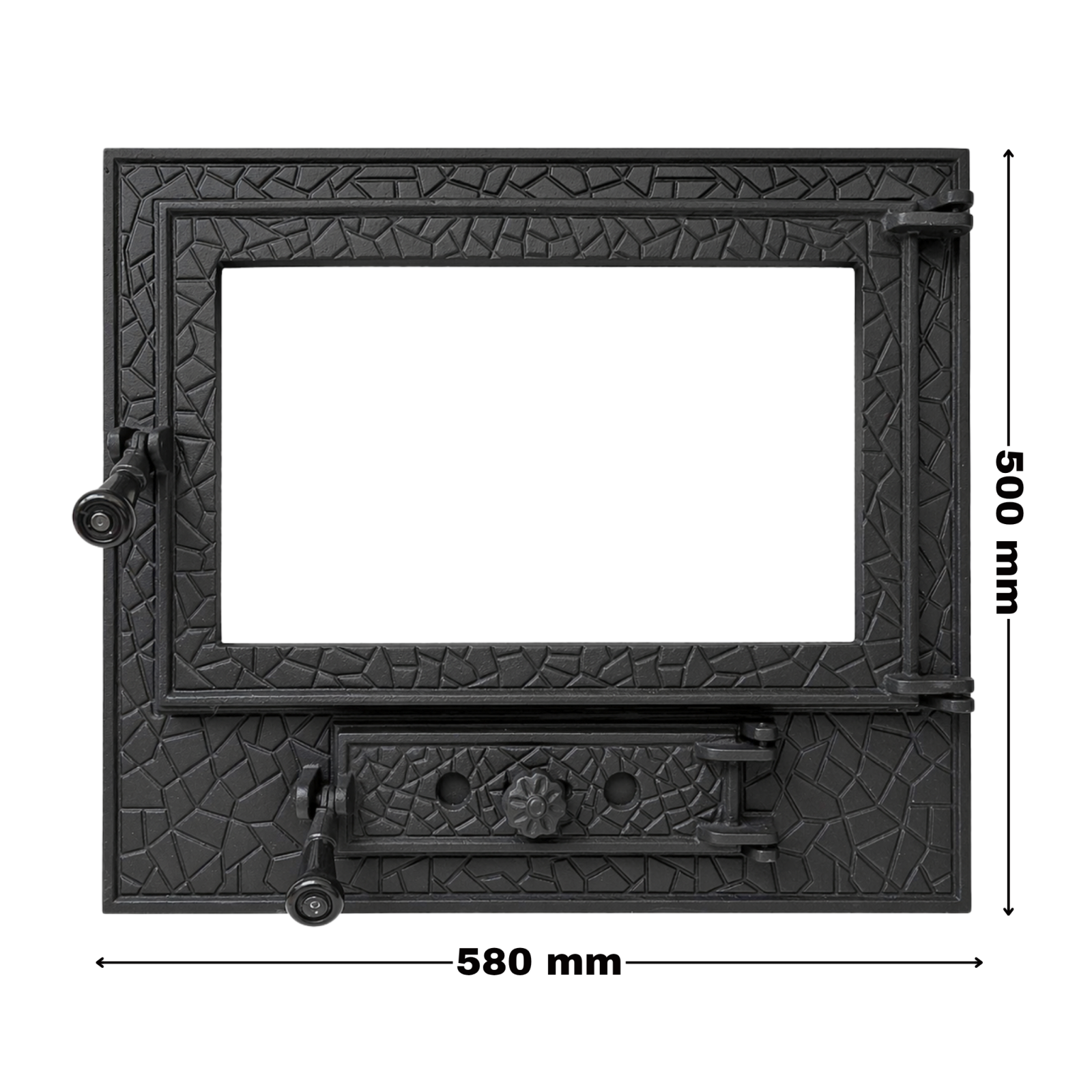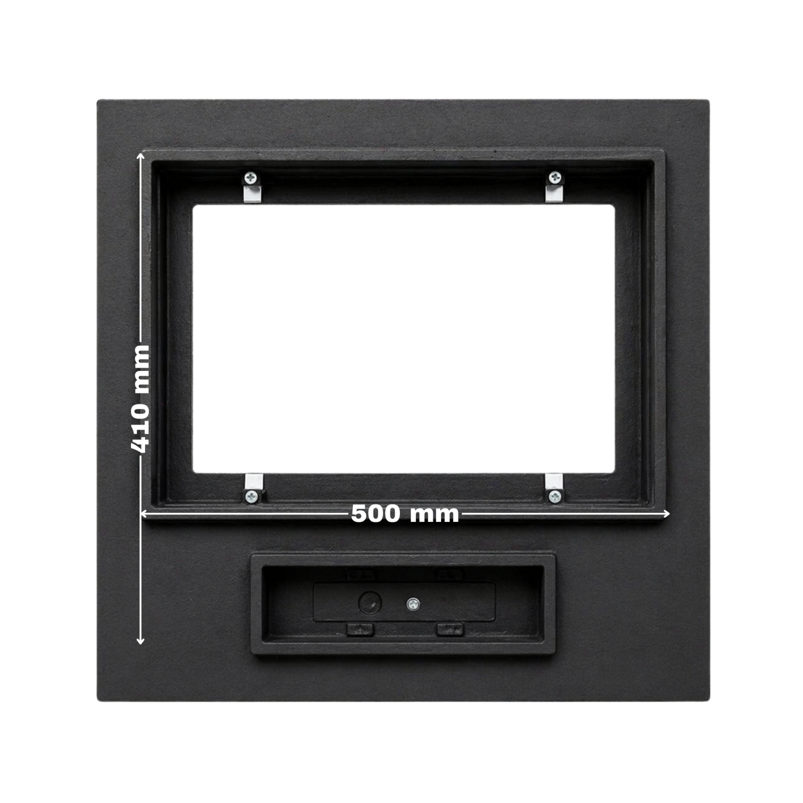 Cu dimensiuni de montaj de 500x410 mm, ușa de șemineu Panoramic mare este potrivită pentru proiecte medii și mari, unde se dorește o vizibilitate amplă asupra focului, eficiență ridicată și un design solid, fiind ideală pentru locuințe moderne, case de vacanță sau spații cu accent pe confort și estetică.