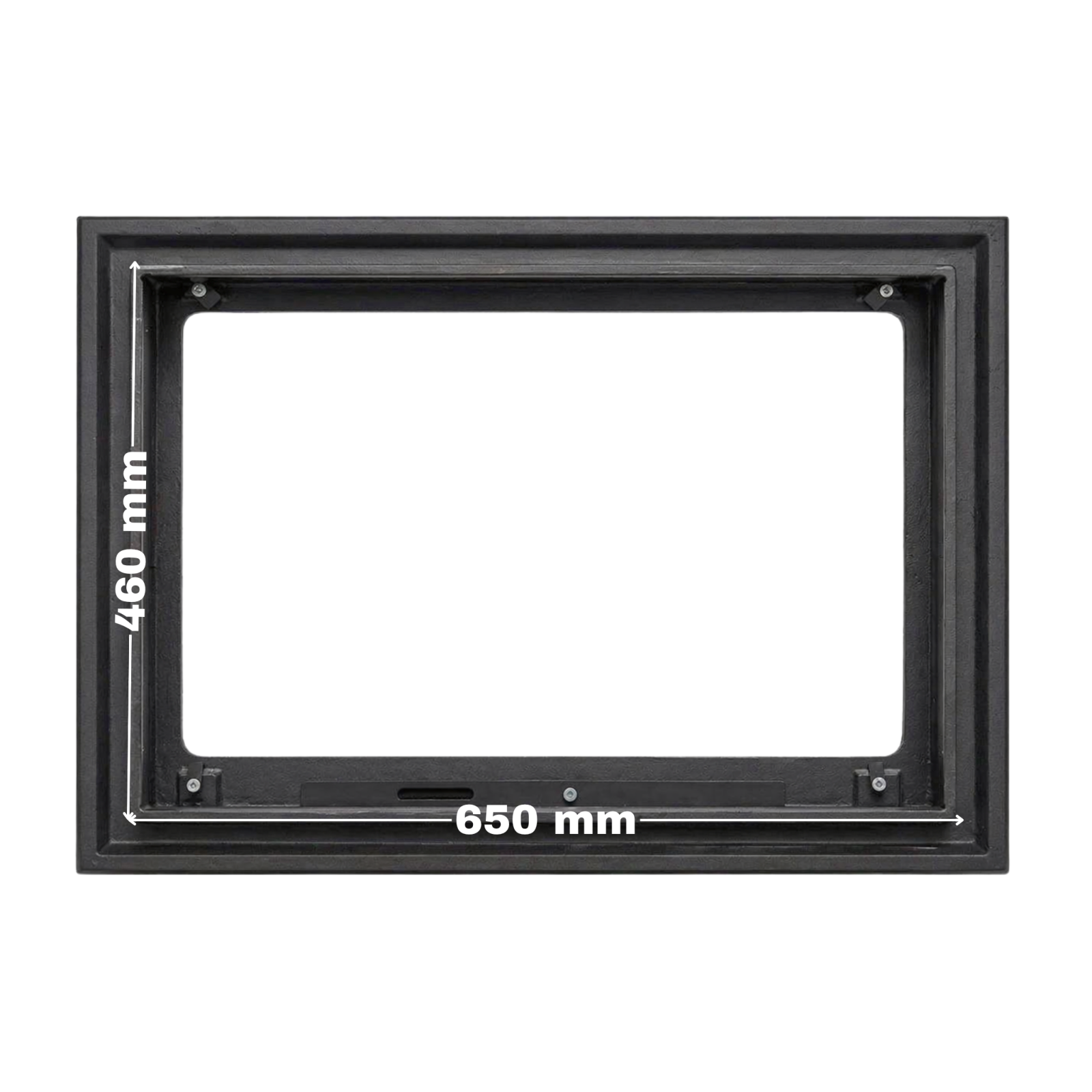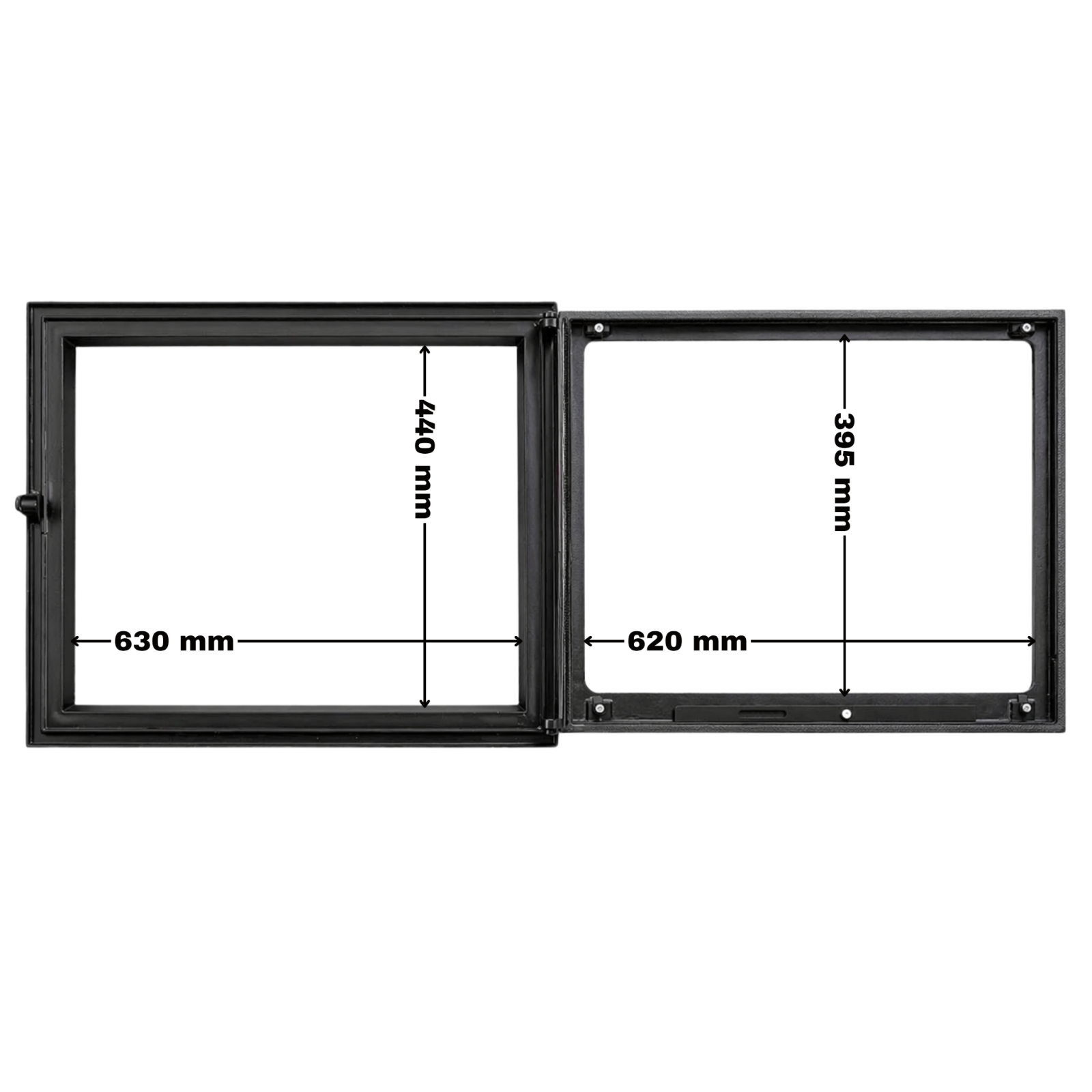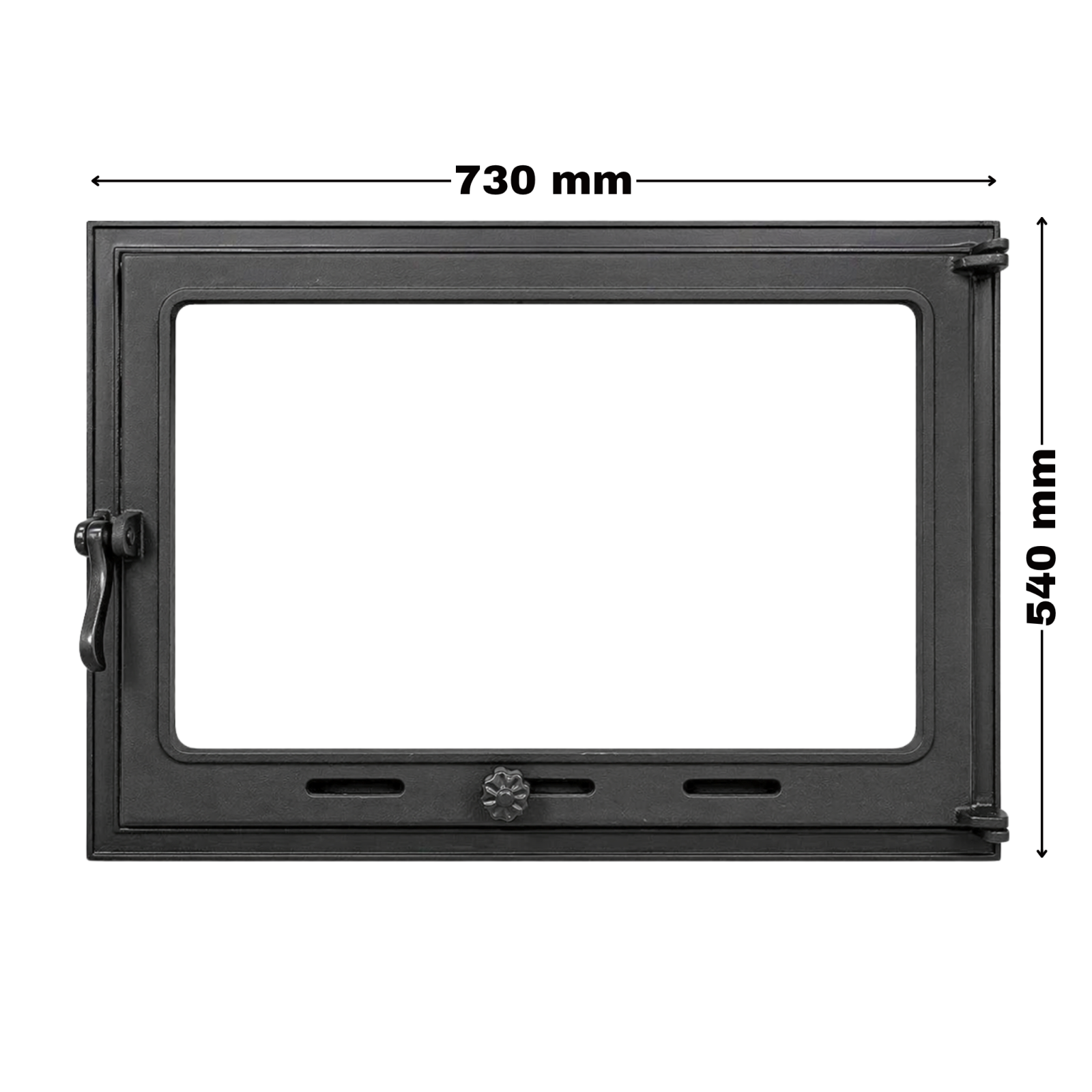 Cu dimensiuni de montaj de 650 x 460 mm, ușa de șemineu Stil 75 este potrivită pentru proiecte mari, unde se dorește o vizibilitate amplă asupra focului, eficiență ridicată și un design solid, fiind ideală pentru locuințe moderne, case de vacanță sau spații cu accent pe confort și estetică.