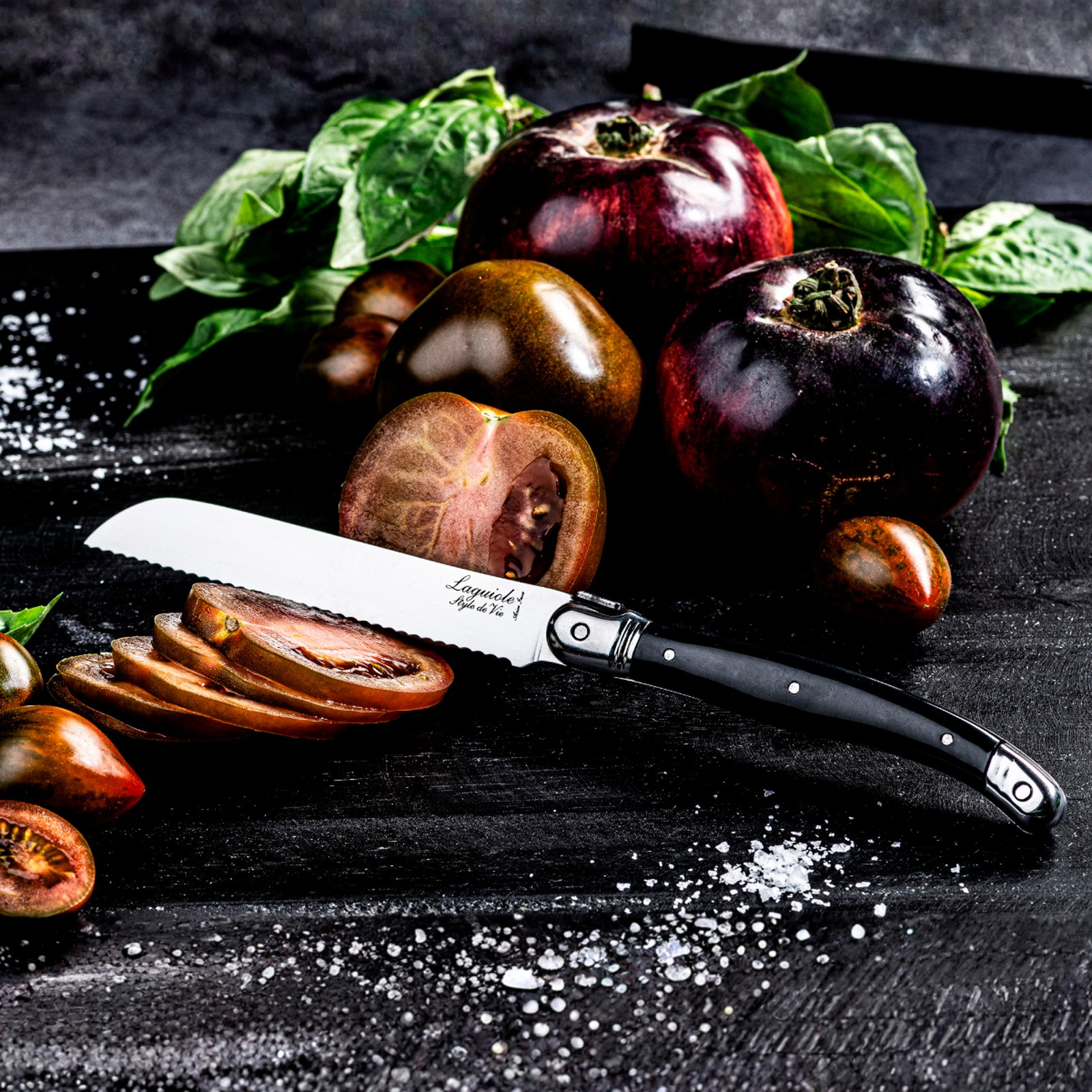 Cutitul curbat se foloseste pentru a da forma legumelor si fructelor. Lama curbata il face ideal pentru a curata un mar, de exemplu. Cu cutitul pentru rosii puteti taia rosiile cu usurinta, dar si chiflele tari nu reprezinta o problema. Cutitul de decojit este cel mai versatil din bucatarie. Se foloseste pentru a toca fin ierburile, a taia si a curata legumele sau chiar a taia carnea. Un set de cutite cu adevarat multifunctional.