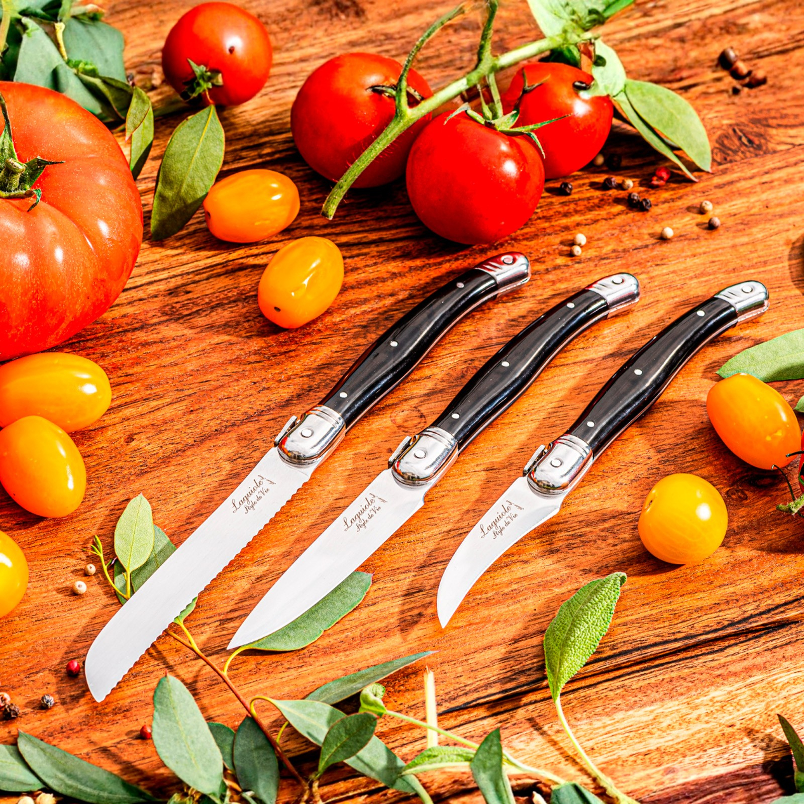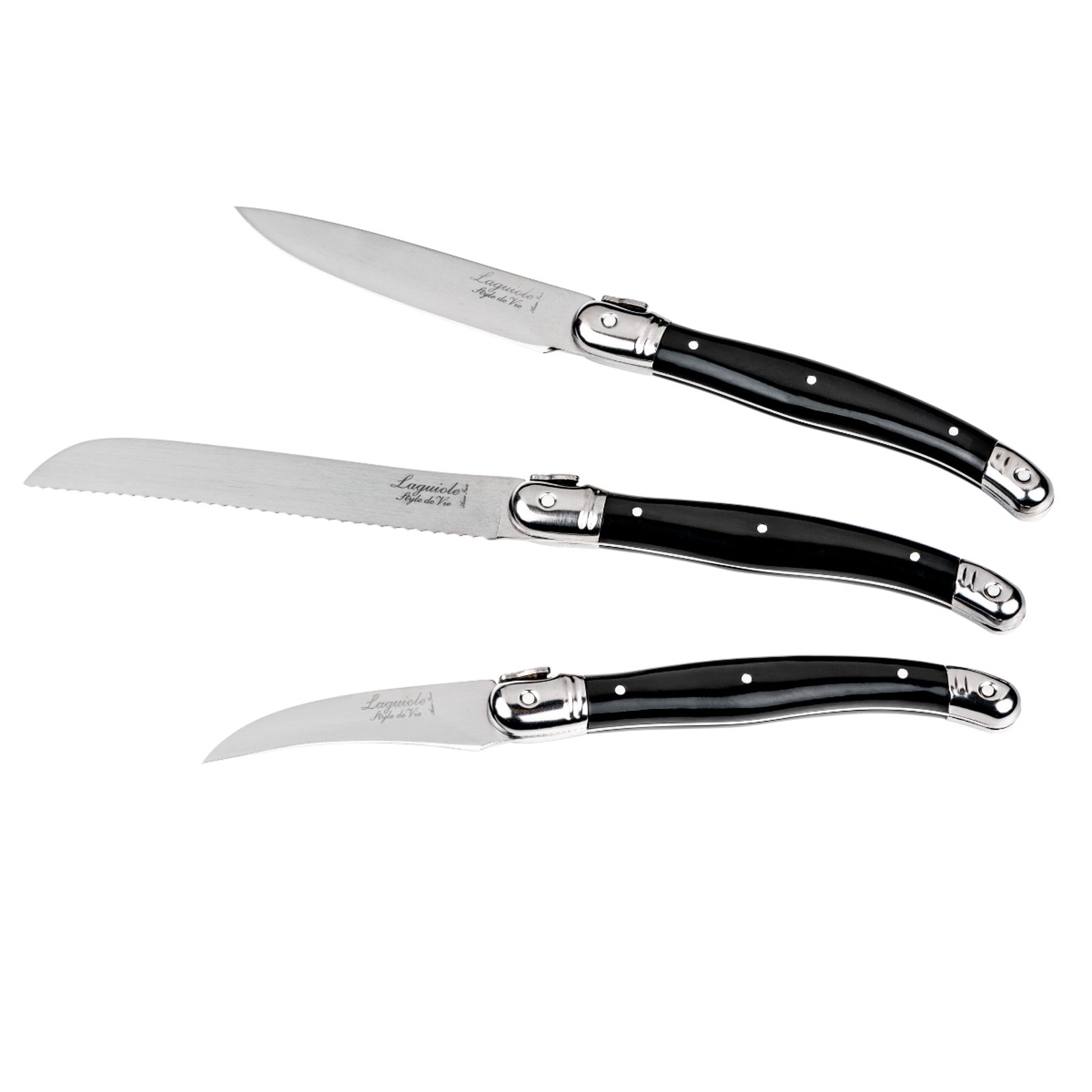 Seturile de cutite sunt indispensabile in bucatarie. Setul de trei cutite de bucatarie Laguiole Style de Vie ofera confort si precizie. Acest set contine un cutit curbat pentru fructe si legume, un cutit pentru rosii si un cutit de decojit.