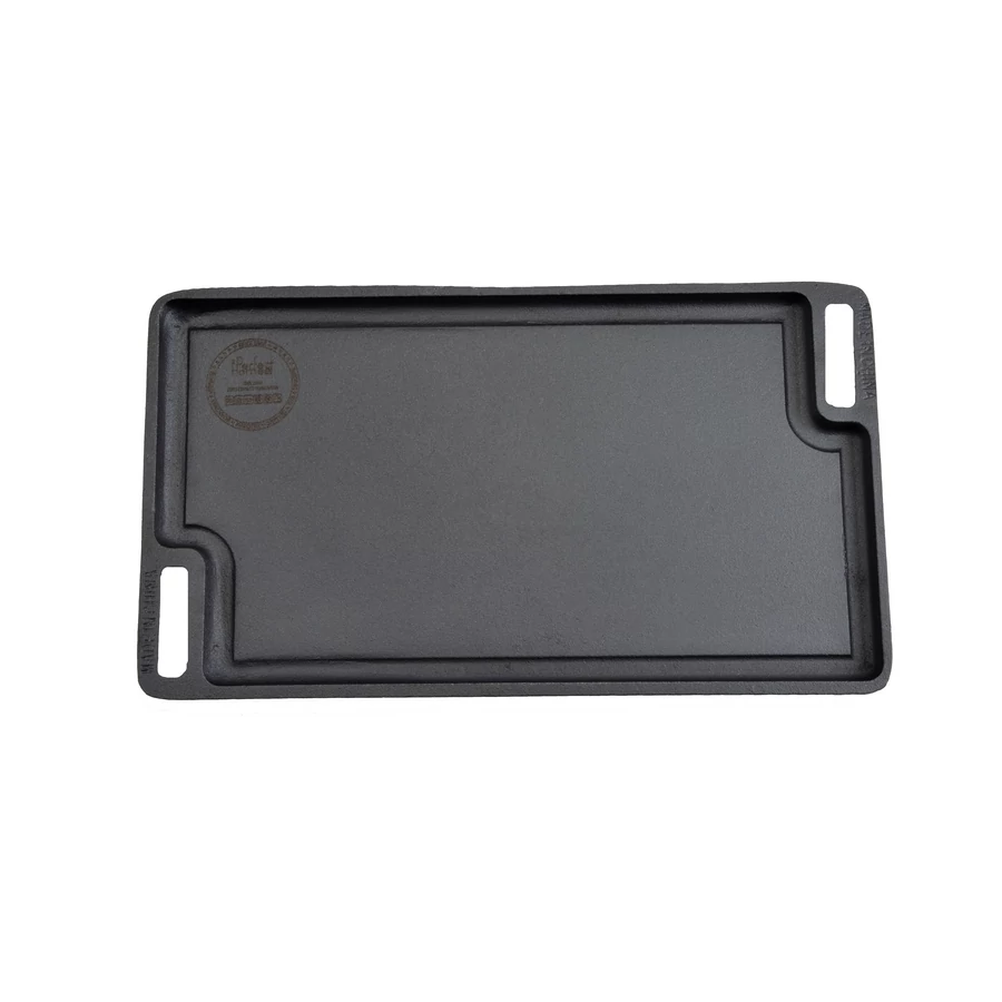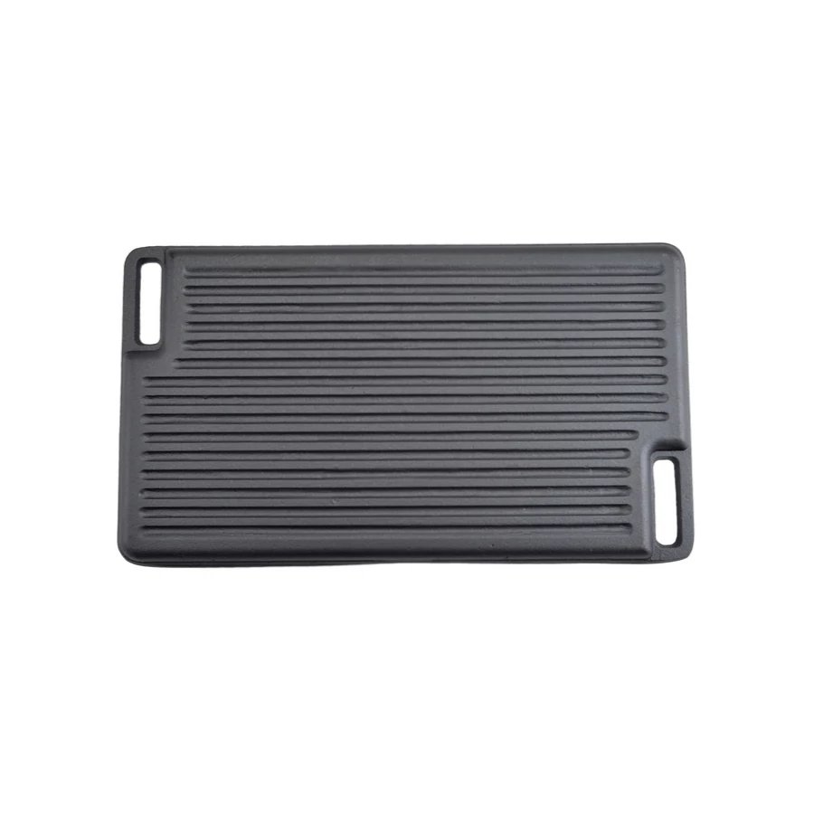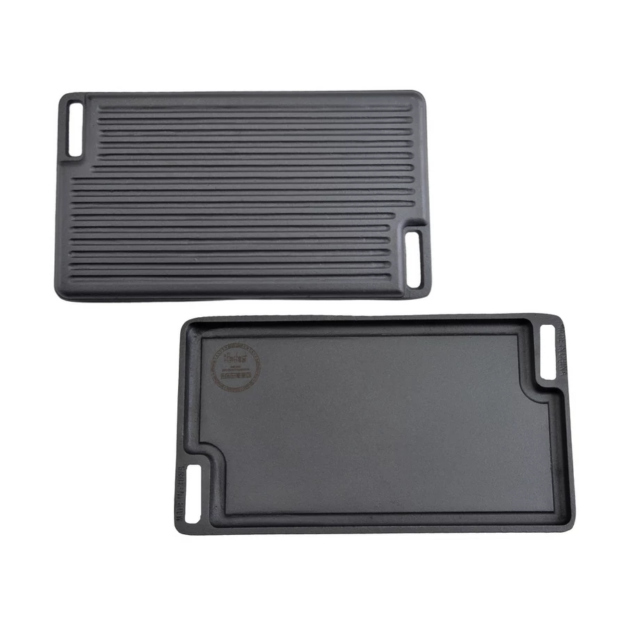 Plită reversibilă din fontă cu două fețe – una grill, cealaltă netedă. Ideală pentru foc deschis, aragaz sau cuptor. Menține căldura uniform. Include canal pentru scurgerea grăsimii.